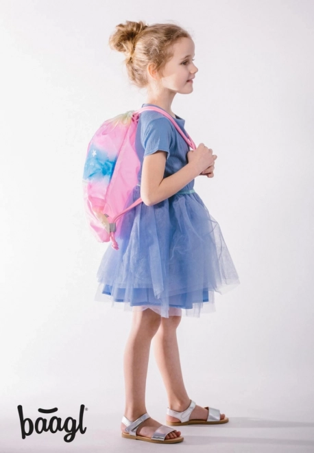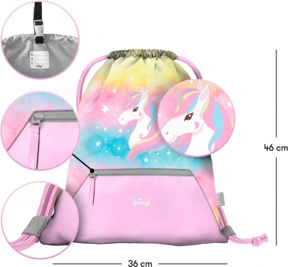 Praktický a stylový sáček BAAGL s motivem Rainbow Unicorn je ideální na přezůvky, tělocvik i volnočasové aktivity. Nabízí pevný omyvatelný materiál, praktickou kapsu na zip a pohodlné nošení na zádech díky pevným tkanicím. Díky karabince ho snadno připnete k aktovce.