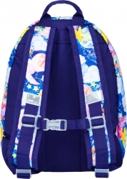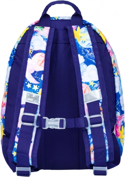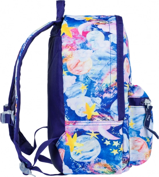 Barevné hvězdy, planety a mraky na modrém podkladu nadchnou každé dítě a dodají batohu originální vzhled, který vynikne ve školce i na výletech.