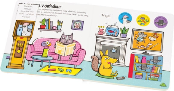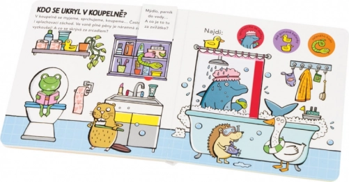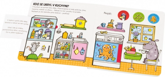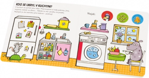 Toto oblíbené leporelo je ideální pro první objevování světa doma. Děti zkoumají kuchyni, obývací pokoj, dětský pokoj, koupelnu i zahrádku a pod odklápěcími prvky hledají schovaná zvířátka. Zábavné úkoly podporují vnímání detailů a porozumění tomu, k čemu jednotlivé místnosti slouží.