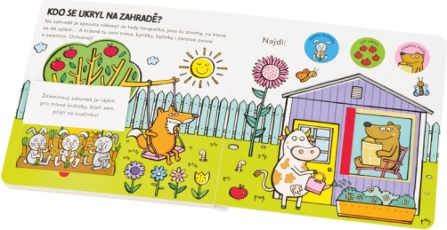 Interaktivní prvky – odklápěcí chlopně a posuvná dvířka – motivují děti k aktivnímu zapojení, procvičují jemnou motoriku a logické uvažování. Krátké úkoly zároveň rozvíjejí počítání, třídění a prostorovou představivost.