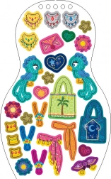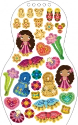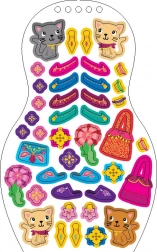 Velké množství samolepek s postavičkou, doplňky, květinami a srdíčky pro tvorbu originálních outfitů a dekorací.