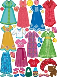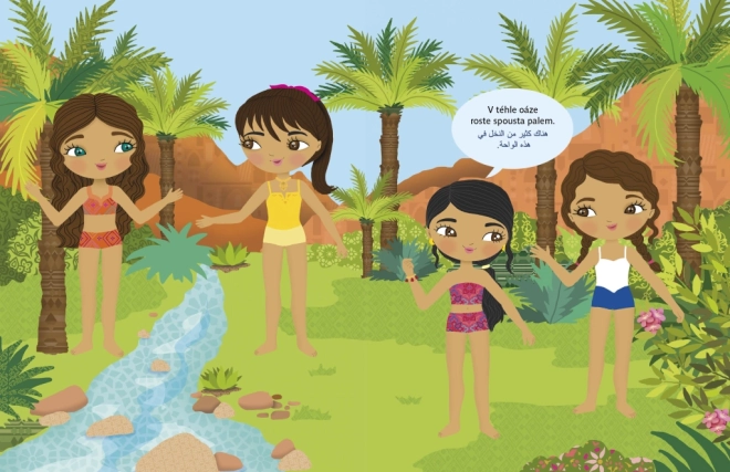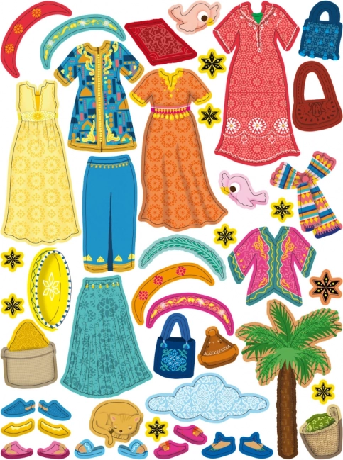 Díky desítkám oblečků a doplňků si děti vyzkouší kombinování outfitů inspirovaných orientální módou. Při lepení samolepek si procvičí jemnou motoriku, souvislé vyprávění i vizuální vnímání. Kniha zároveň rozšiřuje obzory – pomáhá upřesnit představy o cizí zemi, jejích obyvatelích a folklóru.