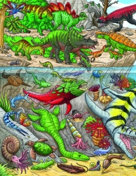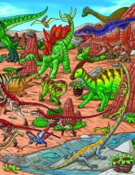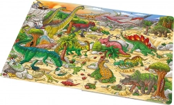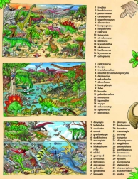 Na každé stránce najdete detailní, krásně barevné ilustrace plné pravěkých tvorů a zábavné úkoly na postřeh: některé ještěry je potřeba znovu a znovu hledat. Kniha je psaná srozumitelně pro děti a na konci nabízí kompletní seznam názvů vyobrazených dinosaurů.