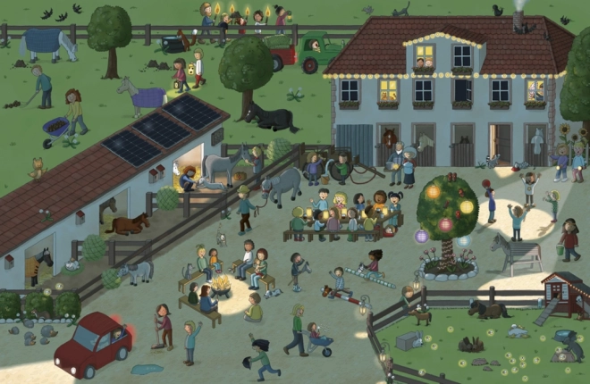 Na každé dvojstraně hledejte postavičky a zvířátka a sledujte jejich drobné příběhy – od rušného dne až po večerní slavnost. Trénuje pozornost i paměť hravou formou.
