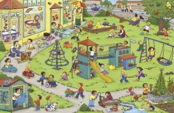 Skluzavky, houpačky a prolézačky přinášejí radost z pohybu i spolupráci s kamarády. Scény z hřiště rozvíjejí představivost a vyvolají spoustu společných témat.