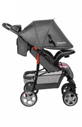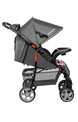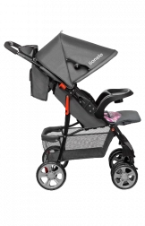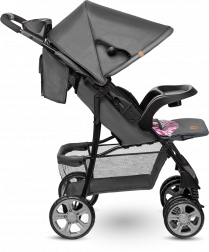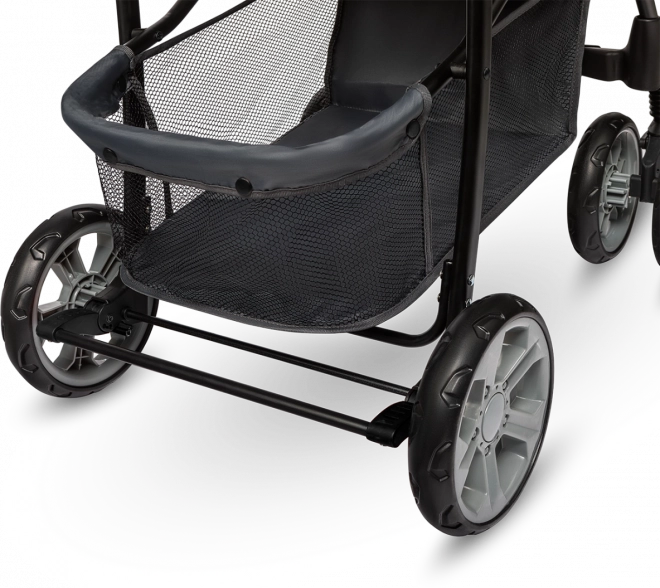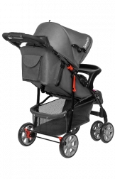 Bezpečnost je prioritou: pětibodové pásy s měkkými chrániči, bariérka s tácem a držákem kelímku a testování dle normy EN 1888 (laboratoř SGS) dávají jistotu při každodenním používání. Obratná EVA kola s měkkým odpružením přední nápravy tlumí nerovnosti, snadno projedou městem a jejich uzamčení pro jízdu rovně drží stabilní směr na dlažbě.