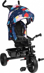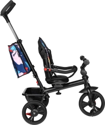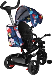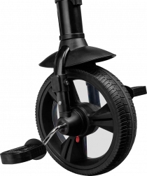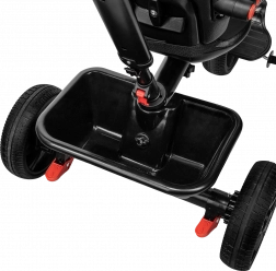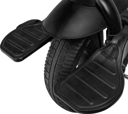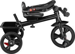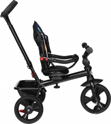 Pro maximální bezpečnost je tříkolka vybavena 3bodovými pásy, madlem pro děti, reflexními prvky a dvojitou brzdou na zadních kolech. Rodič ocení výškově nastavitelnou rukojeť, jednoduché skládání do kompaktní velikosti a praktické příslušenství – košík, tašku a držák na láhev.
