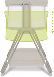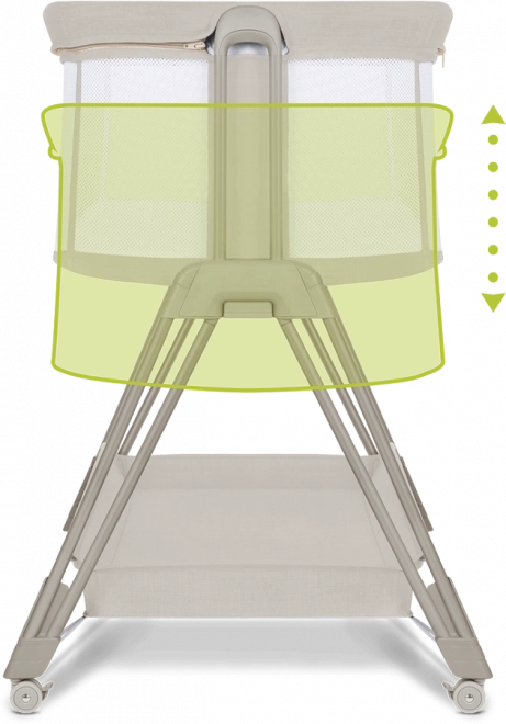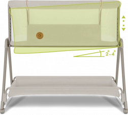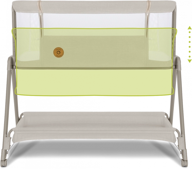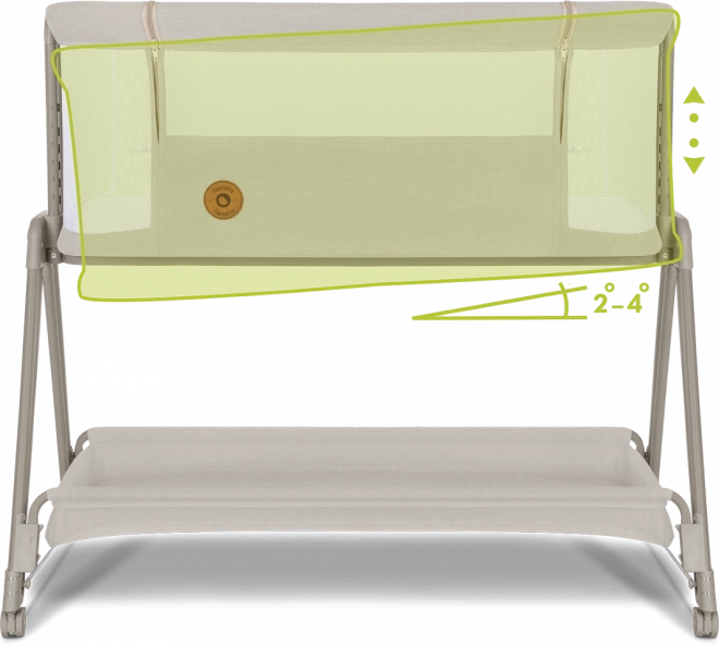 Prodyšné síťované stěny podporují cirkulaci vzduchu a vizuální kontakt, potah snadno sejmete a vyperete pro maximální hygienu. S 7 úrovněmi výšky postýlku jednoduše sladíte s výškou vaší postele; při nachlazení nebo refluxu lze matraci nastavit do mírného sklonu pro větší komfort miminka.