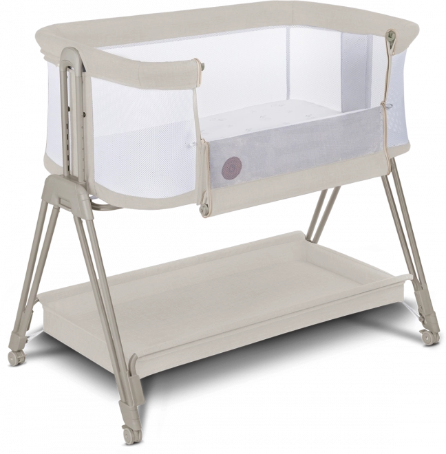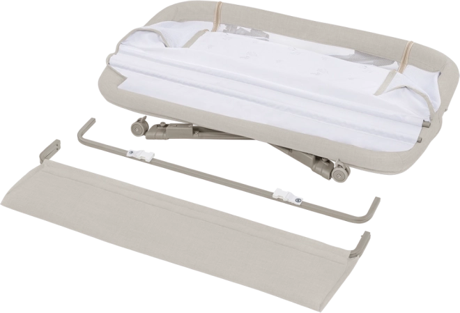 Přenastavte Lunu během chvilky: připněte k posteli pomocí pásů a využijte sklopnou bočnici, nebo ji používejte jako samostatnou volně stojící postýlku.