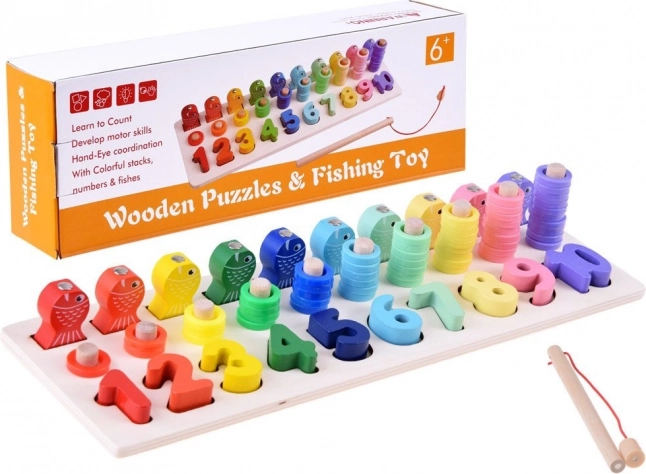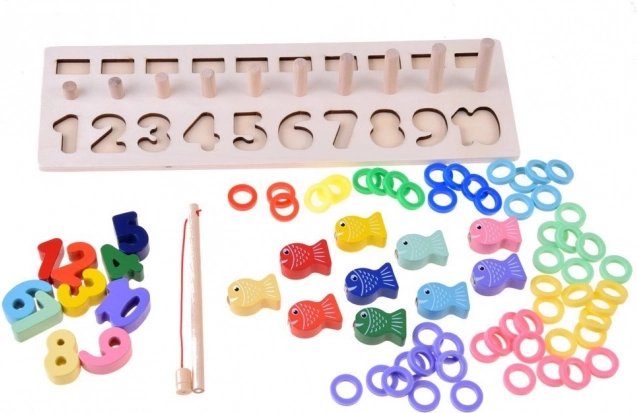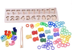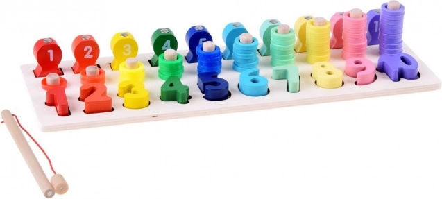 Dřevěná vzdělávací sada umožňuje dětem rozpoznávat tvary a čísla, přitom je učí počítat do deseti.