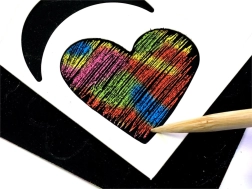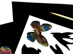 Pod černou vrstvou se skrývají živé barvy, které po vyškrábání vytvářejí efektní obrázky a dekorace.