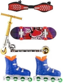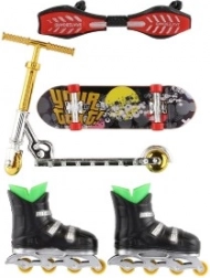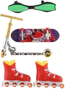Tato prstová sada přináší čtyři oblíbené městské sporty v mini provedení: skateboard, waveboard, in-line brusle a koloběžku. Děti mohou zkoušet nové triky, vytvářet vlastní tratě a rozvíjet kreativitu i obratnost. Díky kompaktním rozměrům se set snadno vejde do batohu a je perfektní pro zábavu kdekoliv.