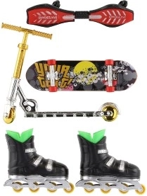 Objevte nekonečnou zábavu s prstovou sadou pro malé nadšence street sportů. V balení najdete mini skateboard, waveboard, in-line brusle a koloběžku pro trénink triků a fantazijní hry. Ideální pro rozvoj jemné motoriky a koordinace, vhodné od 3 let. Prstové triky, mix barevných variant, odolné plastové provedení a kompaktní rozměry pro hraní doma i na cestách.