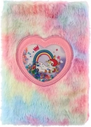 Užijte si psaní a tvoření s tímto stylovým zápisníkem v duhovém plyšovém provedení. Měkký povrch je příjemný na dotek a srdíčkové okénko s flitry a motivem jednorožce dodává obalu hravý, magický vzhled. Zápisník je skvělý pro školu, volný čas i jako osobní deníček.