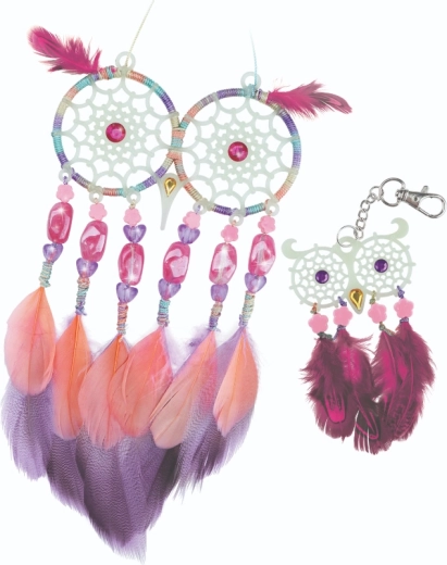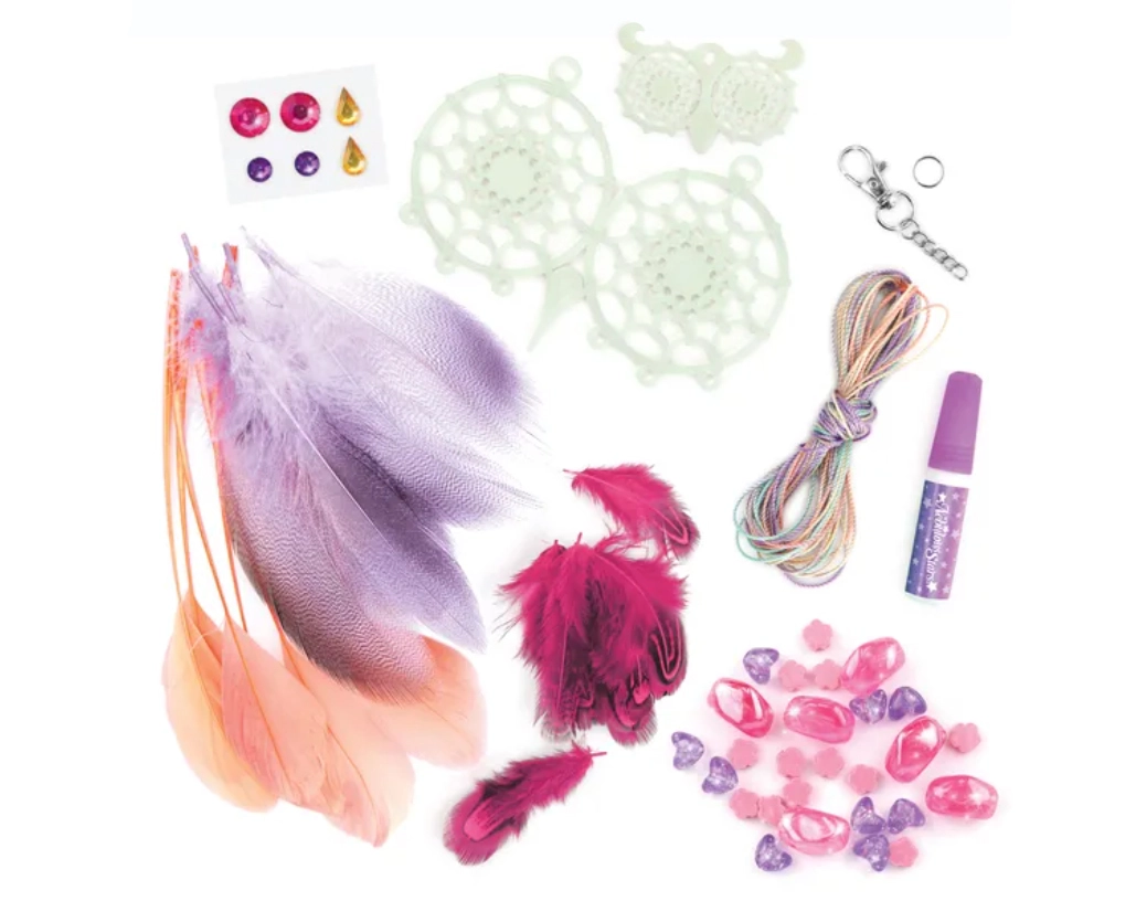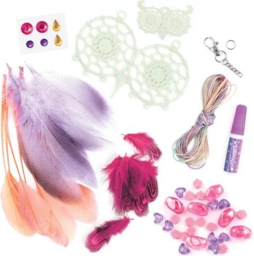Balení obsahuje 2 základny lapače snů zářící ve tmě, bavlněné nitě, 28 peříček, 28 stylových korálků, 6 kamínkových samolepek a lepidlo na šperky.