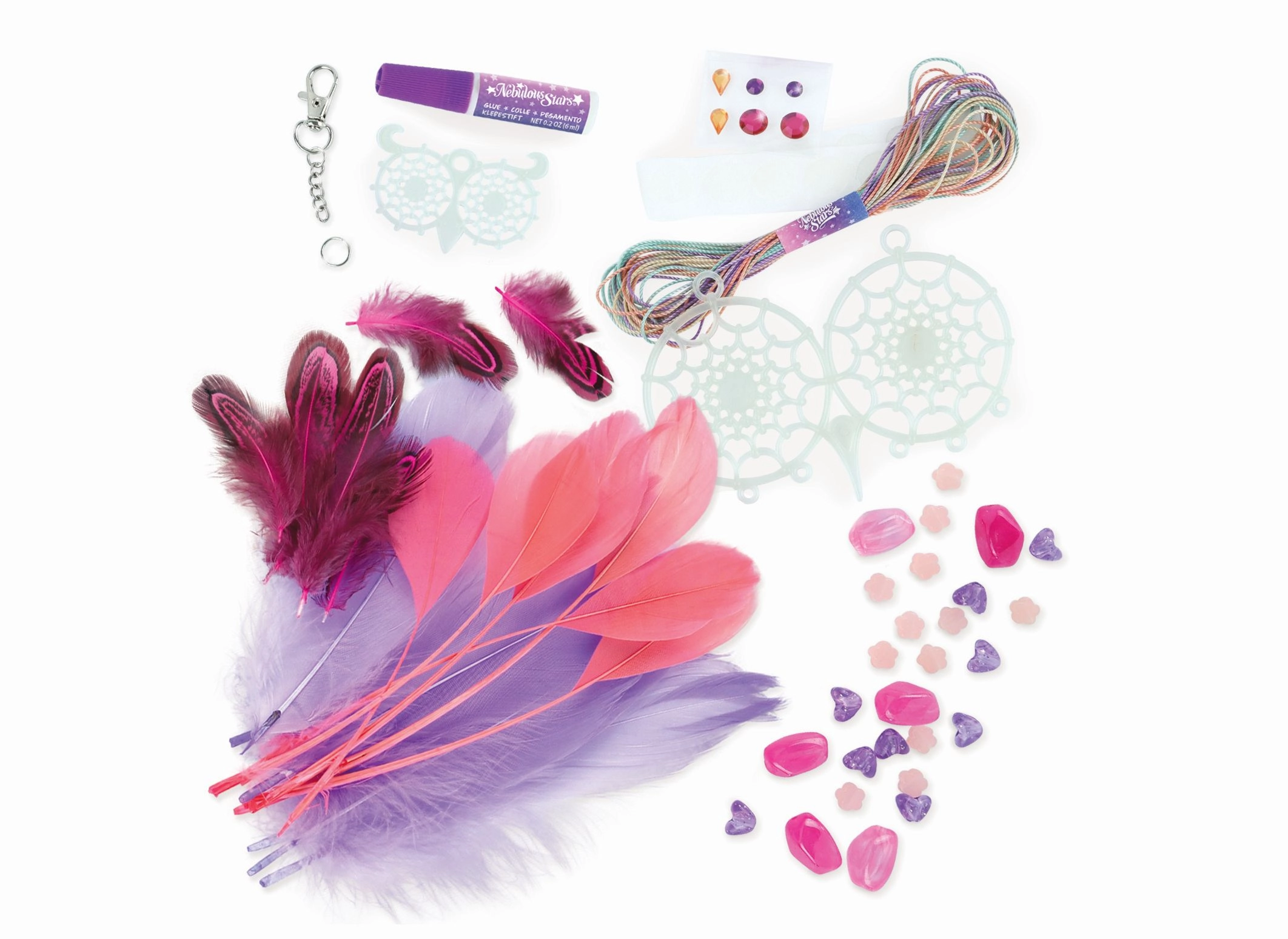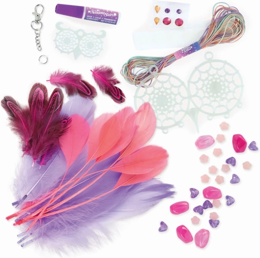 Děti si procvičí trpělivost, navlékání korálků a práci s nitěmi. Díky bohaté výbavě – od peříček přes stylové korálky až po kamínkové samolepky – si snadno vytvoří originální doplňky podle vlastní fantazie.