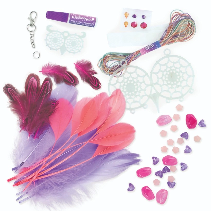 - Kompletní DIY sada: 2 zářící základny, nitě, peříčka, korálky, samolepicí kamínky a lepidlo.