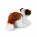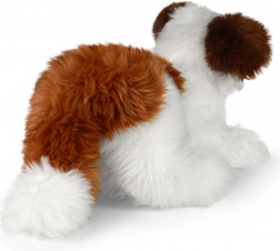 Hnědobílá srst, detailní zpracování a věrné proporce dělají z tohoto shih‑tzu dokonalého parťáka na mazlení i dekoraci.