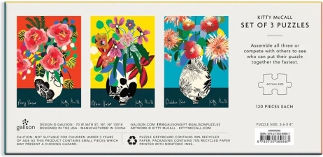 Sada tří uměleckých puzzle přináší výrazné květinové kompozice ve vázách v jedinečném stylu britské umělkyně KITTY MCCALL. Každé z puzzle (120 dílků) zaujme sytými barvami a propracovanými tvary, které rozvíjejí soustředění i estetické vnímání. Díky kompaktním rozměrům se skvěle hodí na rychlé skládání doma i na cestách.