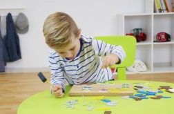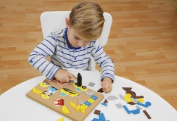 Pěstujte dovednosti jemné motoriky a přesnosti dítěte při používání kladívka k připevňování tvarů na korkovou desku.