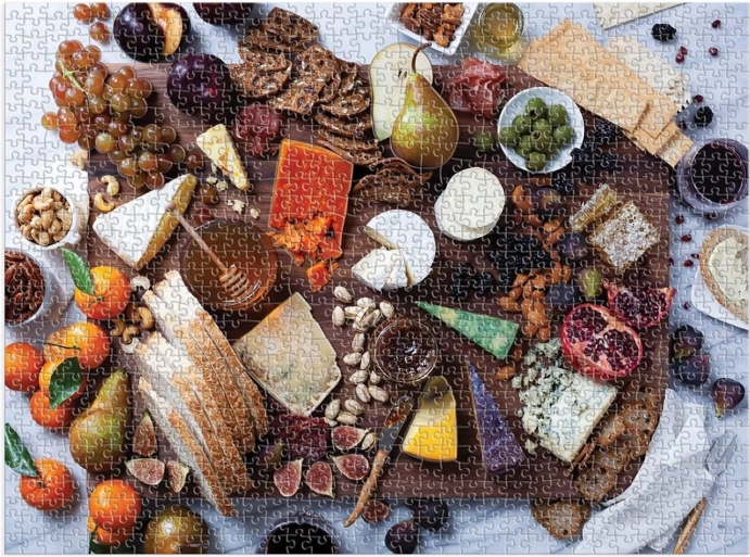 Prémiové puzzle 1000 dílků s motivem sýrového prkénka, matná úprava, 5 mini puzzle, FSC materiály. Krásný dárek a relax pro milovníky designu a gastronomie.