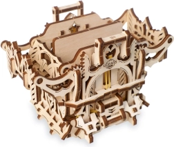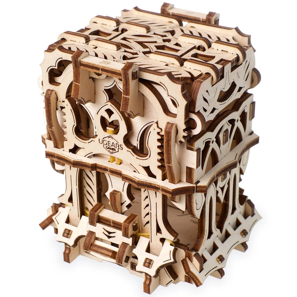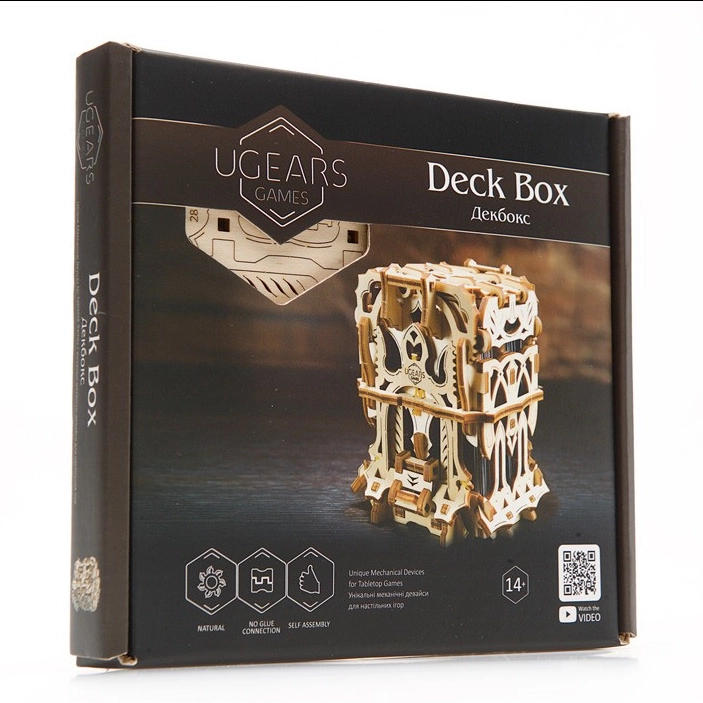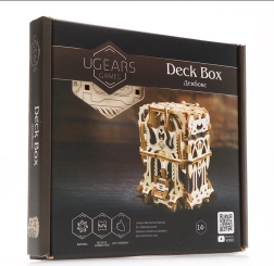 Elegantní dřevěná schránka na karty od UGEARS spojuje mechanický model a praktické úložiště pro vaše balíčky. Obsahuje dvě přihrádky pro až 120 karet standardní velikosti, otevírá se stiskem horních výstupků a zavírá tlačítkem u paty konstrukce. Model z přírodní překližky vyniká fantasy dekoracemi, lze jej snadno sestavit bez lepidla a případně dobarvit akvarely.