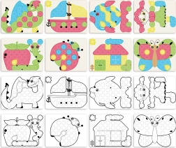 Fantacolor Junior Play Eco+ je chytrá vzdělávací mozaika, která vede děti k tvořivosti a trpělivosti. Díky průhledné perforované desce děti snadno vkládají velké, kulaté kolíky do otvorů a podle ilustrovaných karet skládají roztomilé motivy zvířátek a předmětů.