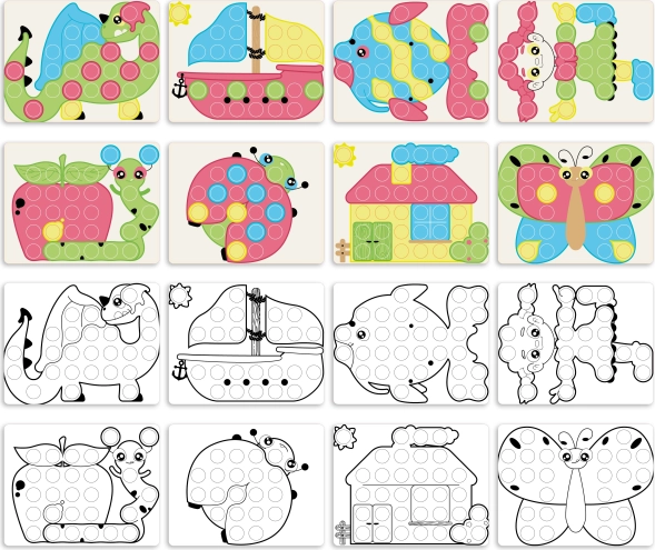 Součástí je 8 ilustrovaných karet s jednoduchými a zábavnými motivy, které rozvíjejí kreativitu a vizuální vnímání.