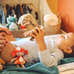 Vyšívané oči, líčka a ústa bez drobných dílů zajišťují bezpečnou hru již od narození. Bavlněný obličej je příjemný na dotek.