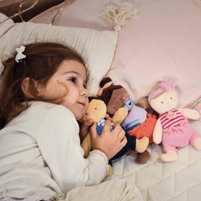 Tato hebká panenka v oranžové barvě je ideální první hračkou pro miminka. Je lehká, dobře padne do ruček a díky měkkému provedení se s ní dětem skvěle manipuluje. Panenka drží v ruce malou lahvičku a podporuje rozvoj jemné motoriky a fantazie.