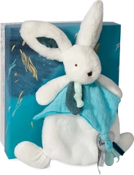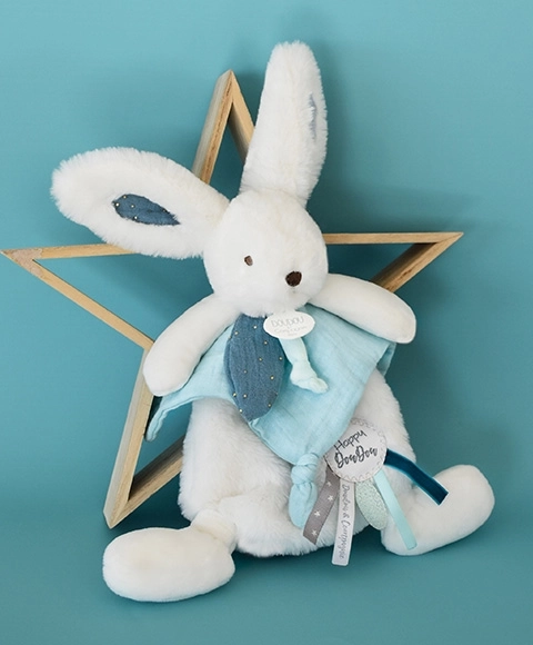 Tato dárková sada značky Doudou přináší hebkého plyšového králíčka s muchláčkem, který potěší miminko i rodiče. Stylové provedení s jemnými stuhami a moderní modrou barvou z něj dělá krásnou ozdobu dětského pokojíčku i oblíbenou hračku na mazlení.