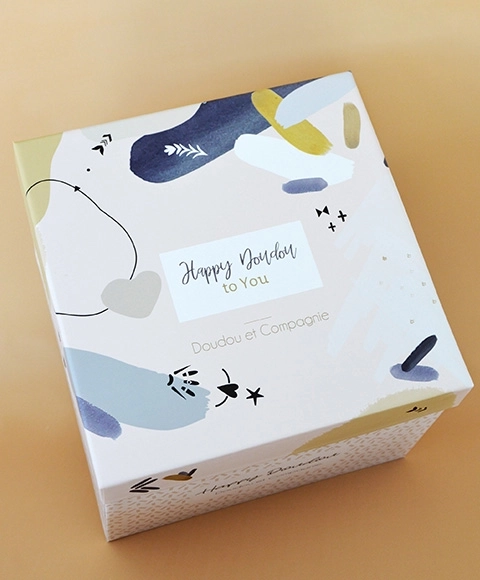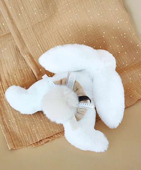 Stylový detail v podobě béžové bambulky a šátku kolem krku podtrhuje moderní vzhled hračky. Králíček je uložen v elegantní dárkové krabičce – ideální pro narození miminka, křtiny nebo jako milý dárek k jakékoli příležitosti.