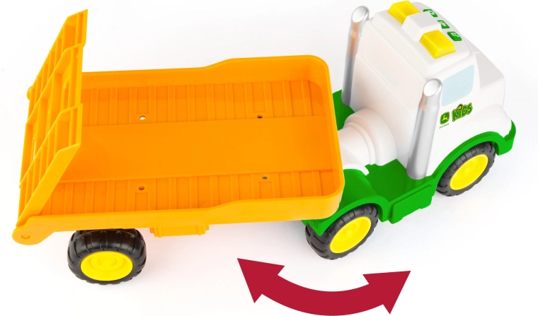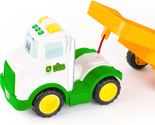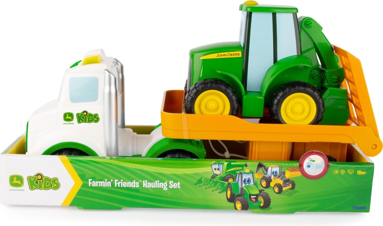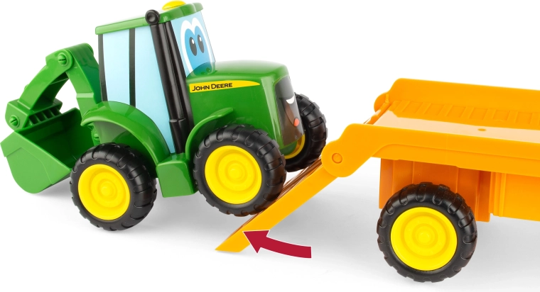 Tato hrací sada kombinuje tahač s nájezdem a přátelský traktor Johnny v klasických barvách JOHN DEERE. Děti si procvičí jemnou motoriku při nakládání a vykládání a zároveň rozvíjejí představivost při hraní na farmu. Díky velikosti 37 cm je set dobře uchopitelný a stabilní.