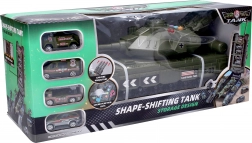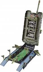 Zábavná hračka pro malé závodníky i milovníky vojenské techniky: garážový tank o délce 44 cm ukrývá 4 auta (7 cm) s volnými koly, nabízí světelné a zvukové efekty a po rozevření se promění v akční herní set s rampami a vystřelovacími kanóny.
