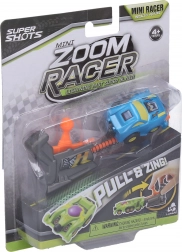 Auto vystřelovací závoďák Mini Zoom. Velikost 5 cm. 4 varianty - modrá, červená, žlutá, zelená. Prostřední otvor v autíčku se nasune na pružinku. Zatažením za oranžovou páčku se autíčko uvolní a vystřelí. Obrázkový návod na obalu.