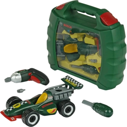 Tento realistický set na licenci BOSCH mini obsahuje dětský aku šroubovák Ixolino s otočným bitem a zvukovým efektem, šroubovák, šrouby a všechny díly potřebné ke stavbě tmavě zeleného závodního auta. Vše je přehledně uloženo v pevném plastovém kufříku s průhledným víkem a pohodlným madlem, takže si hračku snadno vezmete kamkoli s sebou.