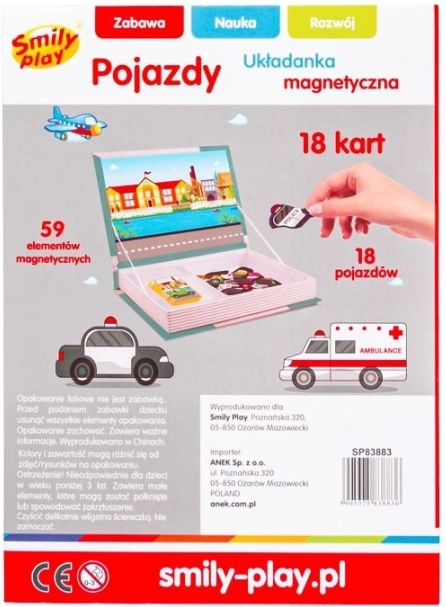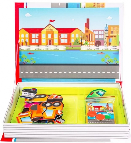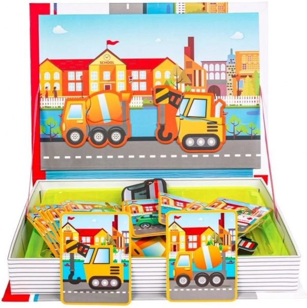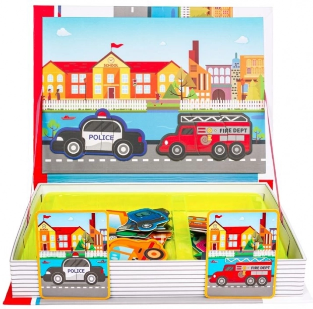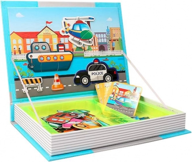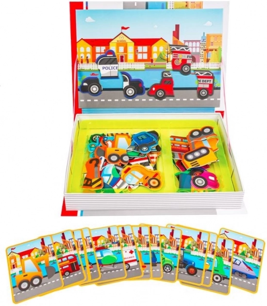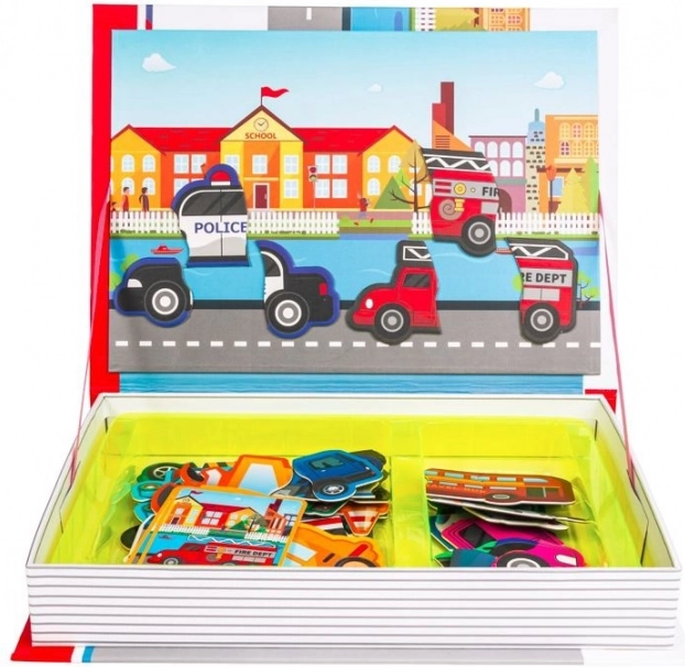 Magnetická skládačka s motivem dopravních prostředků je uložena v uzavíratelné krabičce ve tvaru knihy, která po otevření slouží jako podložka pro skládání. Z přiložených dílků děti vytvářejí různé vozy, stroje a prostředky hromadné dopravy podle karet s předlohami, nebo podle vlastní fantazie.