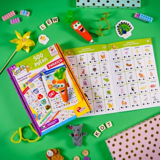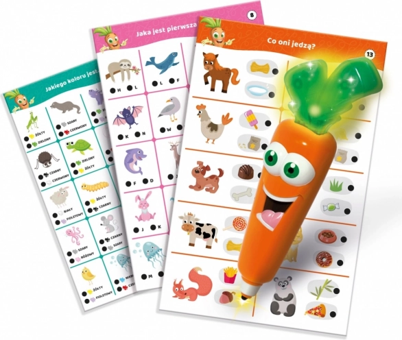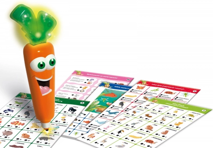 Objevte zábavné učení se zvířaty s hrou Carotina – 500 otázek: Zvířata. Děti od 3 let odpovídají na otázky pomocí mluvící a svítící tužky ve tvaru mrkve, která okamžitě dává zpětnou vazbu. S 30 vzdělávacími kartami a režimem Hledej a najdi si procvičí logické myšlení, pozorovací schopnosti, koordinaci oko–ruka a rozšíří slovní zásobu.