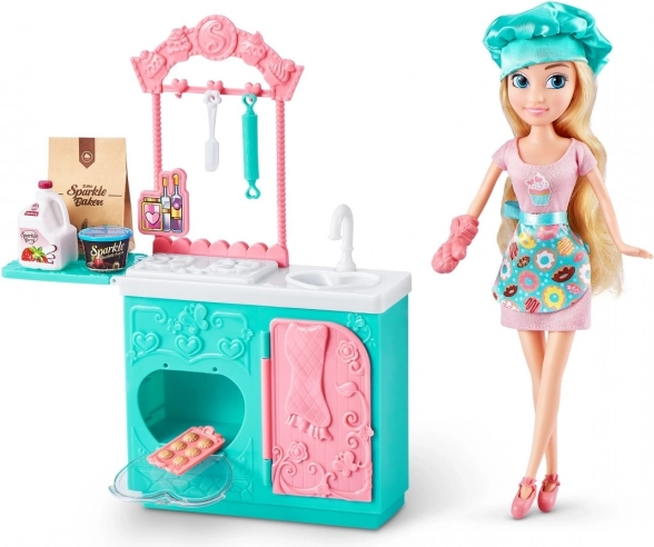 Set obsahuje nezbytné prvky pro hru, včetně malých hračkových potravin, mís, špachtlí a formiček, které umožňují realisticky napodobit pečení. Otevřete troubu, vložte do ní sušenky a předstírejte, že se pečou! Díky výměnným oděvům lze panenku kombinovat s dalšími postavičkami z řady Sparkle Girlz.