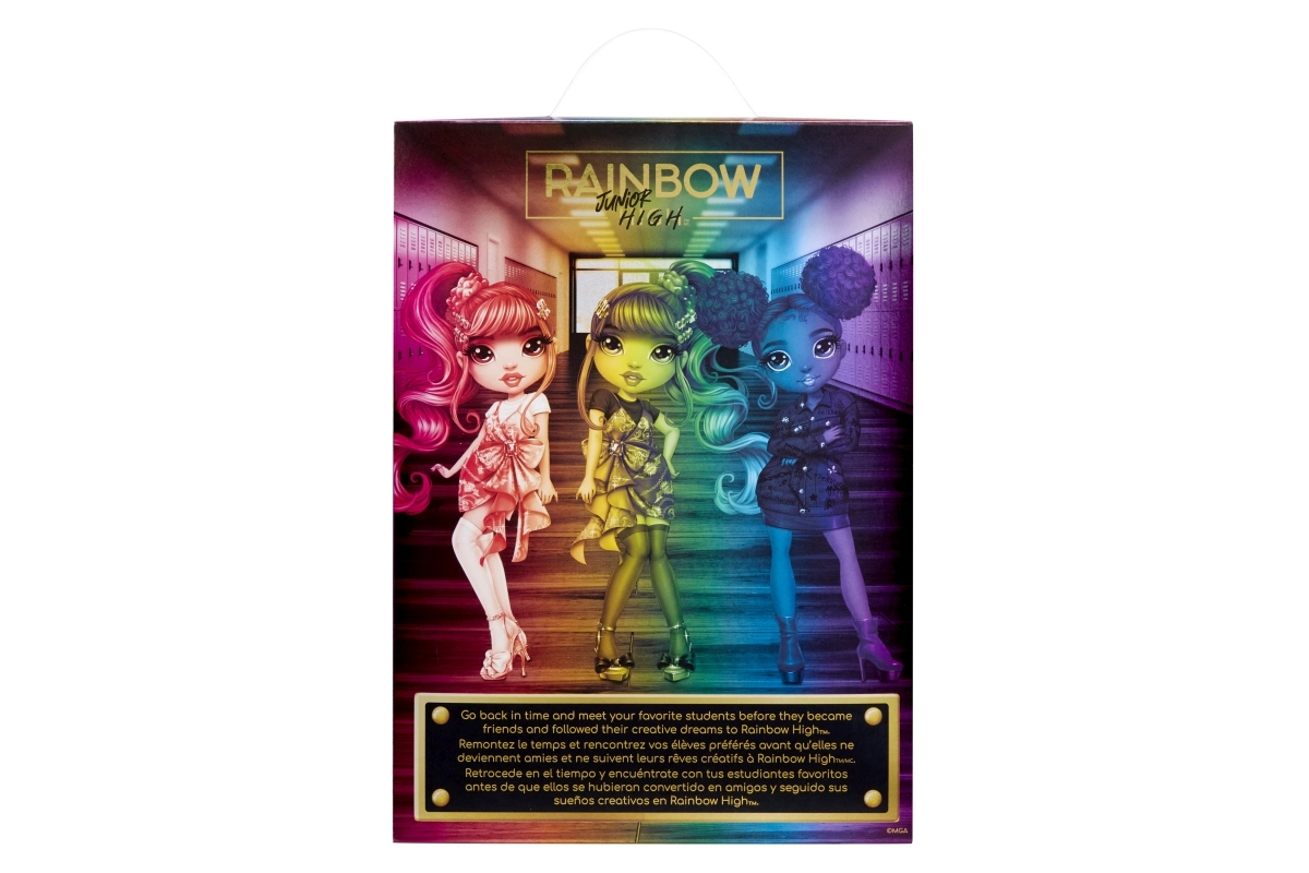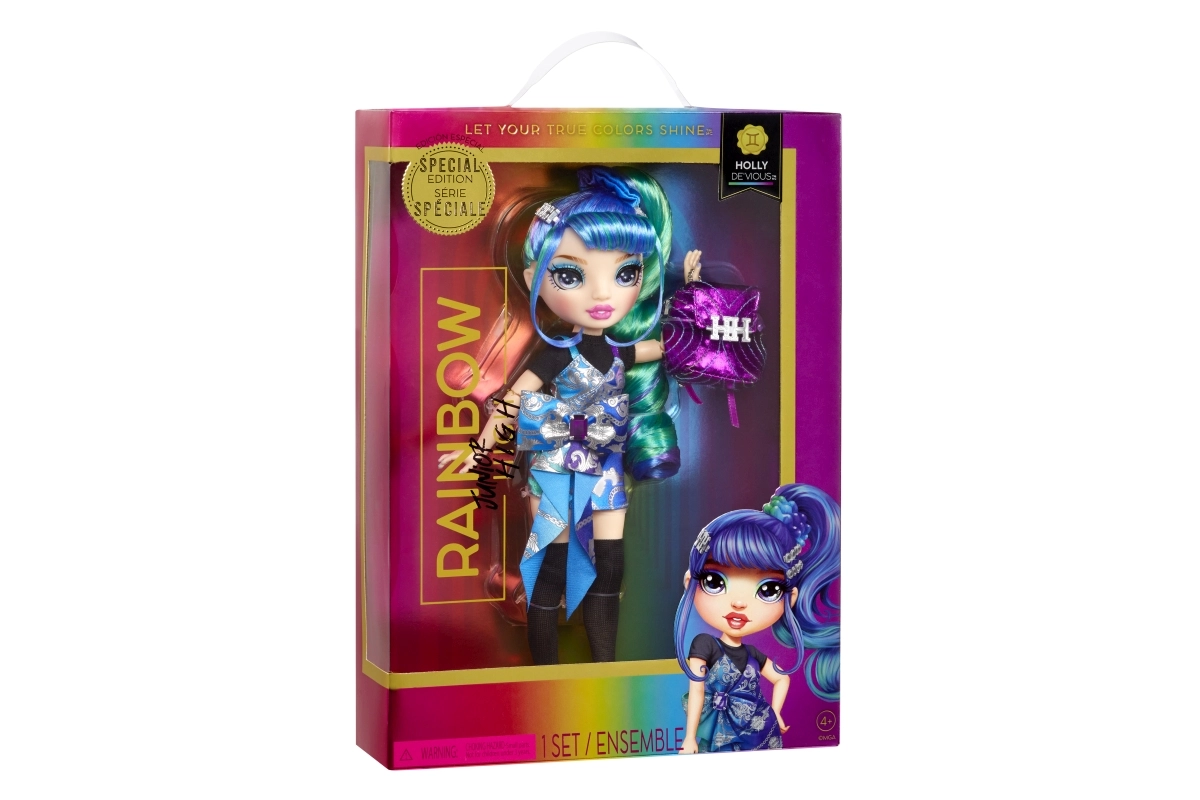 Rainbow High Junior panenka – speciální edice Holly. Menší velikost 22 cm, pohyblivé klouby, česatelné vlasy, outfit, batoh, hřeben a stojan.