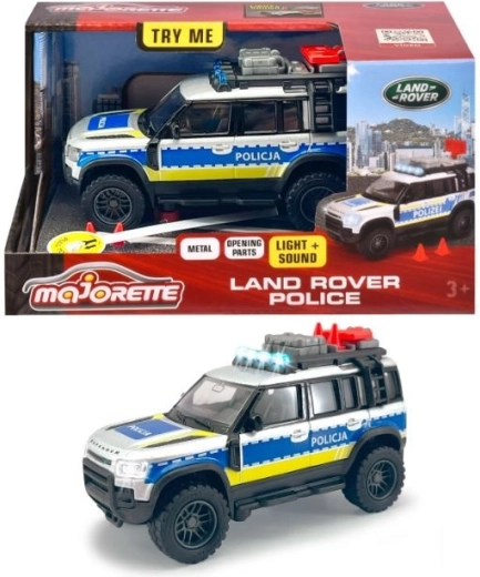 Rozšiřte dětskou sbírku o detailní policejní vůz MAJORETTE Grand Land Rover v měřítku 1:43 a délce 12,5 cm. Robustní kovová konstrukce, gumové pneumatiky pro jízdu po různých površích, otevírací zadní dveře a střešní box, plus světelné a zvukové efekty. Oficiálně licencovaný LAND ROVER potěší realistickými detaily a odolností. Baterie 2× AAA jsou součástí balení. Vhodné od 3 let.