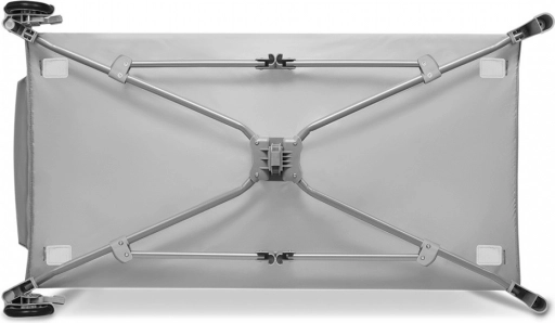 Nová matrace z pružné PUR pěny T25 (25 kg/m3) o tloušťce 2 cm na podkladu z dřevěných lamel poskytuje rovnoměrnou oporu celého těla, je odolná vůči deformacím a dobře dýchá. Praktická výbava zahrnuje boční vstup na zip, kapsu na drobnosti, zvýšenou konstrukci proti chladu od podlahy, dvě kolečka a jednoduché skládání do přenosné tašky s uchem.