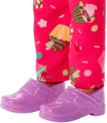 Loutka Barbie je oblečena do bílé kuchařské bundy s růžovými detaily a čepicí kuchaře, což jí pomáhá v roli cukrářky.