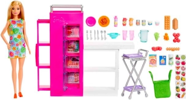 Tato sada obsahuje více než 30 různých doplňků včetně vajec, zeleniny a jídel, což umožňuje personalizaci a kreativní hru. Ať už připravujete večeři nebo pořádáte nákup, Barbie je připravena na vše ve své květinové sukni s taškou na nákupy.