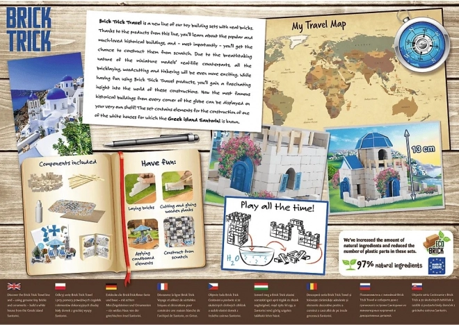 Objevte kouzlo středomořské architektury se stavebnicí BRICK TRICK Travel Santorini. Z opravdových hliněných cihliček a dřevěných prvků sestavíte typický bílý domek s modrými střechami. Stavebnice je opakovaně použitelná (lepidlo je rozpustné ve vodě), rozvíjí zručnost, představivost a sou soustředění, a nabízí více než 210 dílků včetně dekorací a papírových figurek.