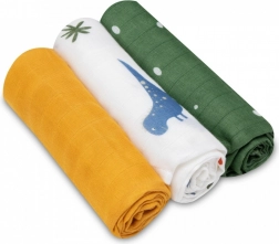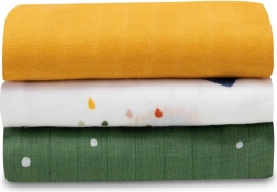 Tři pleny v rozměru 70 × 70 cm s různými motivy pro každodenní použití – do kočárku, na kojení, přebalování i jako lehká dečka.