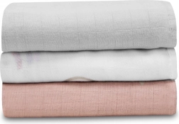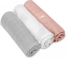 Tři barevně sladěné pleny s rozměrem 70 × 70 cm poslouží k zavinování, při kojení, krmení i jako podložka na přebalování – doma i na cestách.