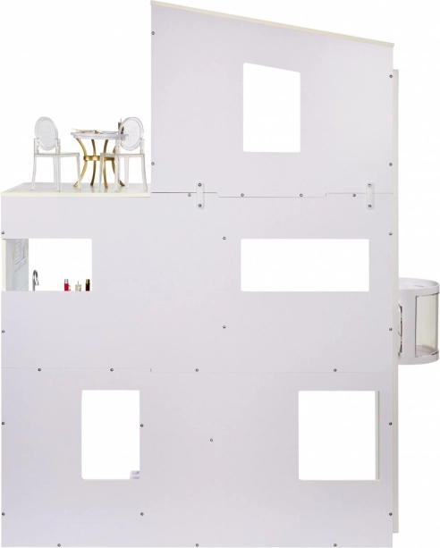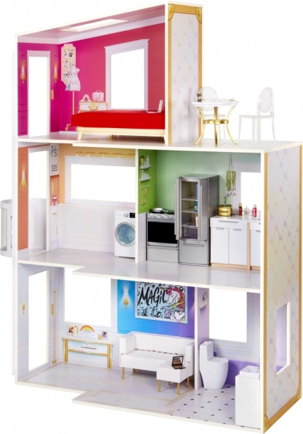 Domeček Rainbow High Townhouse přináší do dětského pokoje styl a zábavu. Tři podlaží s ložnicí, obývacím pokojem, kuchyní a koupelnou vytvářejí realistické prostředí pro každodenní příběhy. Kompaktní rozměry 89,87 × 26,04 × 50,5 cm se skvěle hodí do většiny dětských pokojů, zatímco robustní konstrukce zajistí dlouhou životnost hračky.