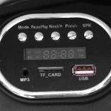 Oblíbené písničky z USB, SD karty či přes AUX. Součástí jsou i přednahrané melodie a klakson přímo na volantu.