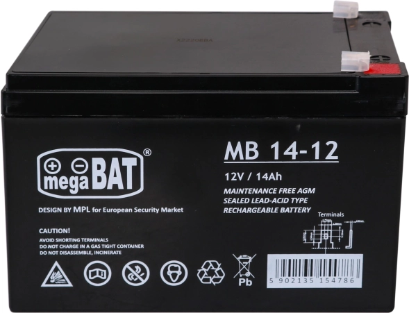 Kapacita 14Ah poskytuje spolehlivý chod zařízení a záložní energii pro alarmy, osvětlení a telekomunikační systémy.
